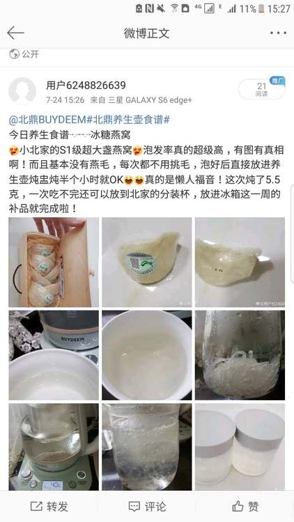 @北鼎BUYDEEM#北鼎养生壶食谱# 今日养生食谱[最右][最右]冰糖燕窝 北家的S1级超大盏燕窝,泡发率真的超级高,有图有真相啊!而且基本没有燕毛,每次都不用挑毛,泡好后直接放进养生壶炖盅炖半个小时就OK!真的是懒人福音!这次炖了5.5克,一次吃不完还可以放到北家的分装杯,放进冰箱这一周的补品就完成啦!