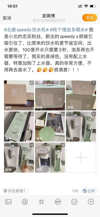 #北鼎speedy饮水机# #找个理由多喝水# 我是小北的忠实粉丝,新出的speedy s就被它吸引住了,比原来的饮水机更节省空间,出水更快,100度开水只需要3秒,泡茶再也不需要等待了,我买的是绿色,没有配上水器,特意加购了上水器,真的非常方便,不用再去装水了。[爱你][爱你][爱你]很满意!!!@北鼎