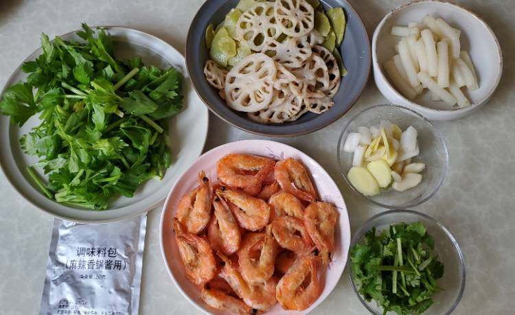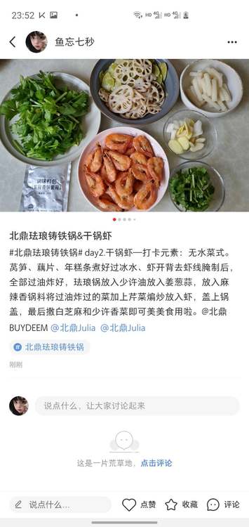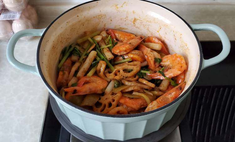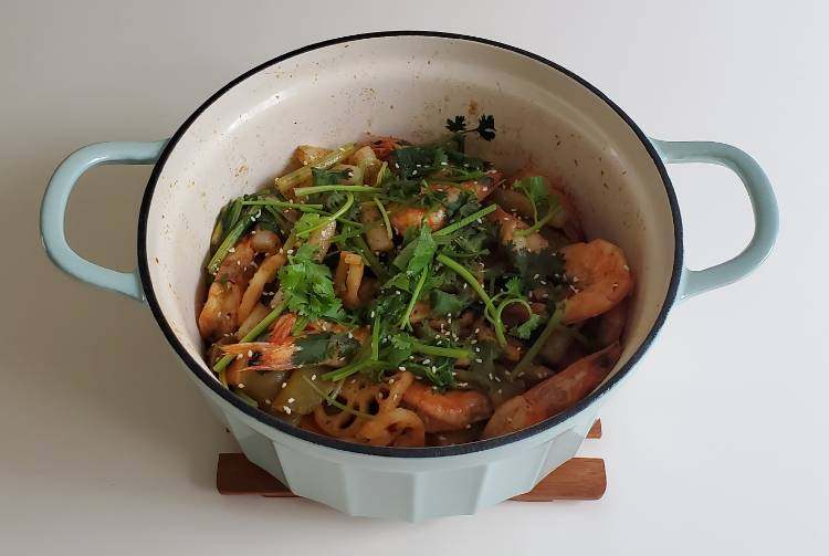 #北鼎珐琅铸铁锅# day2.干锅虾—打卡元素:无水菜式。莴笋、藕片、年糕条煮好过冰水、虾开背去虾线腌制后,全部过油炸好,珐琅锅放入少许油放入姜葱蒜,放入麻辣香锅料将过油炸过的菜加上芹菜煸炒放入虾,盖上锅盖,最后撒白芝麻和少许香菜即可美美食用啦。@北鼎BUYDEEM @北鼎Julia