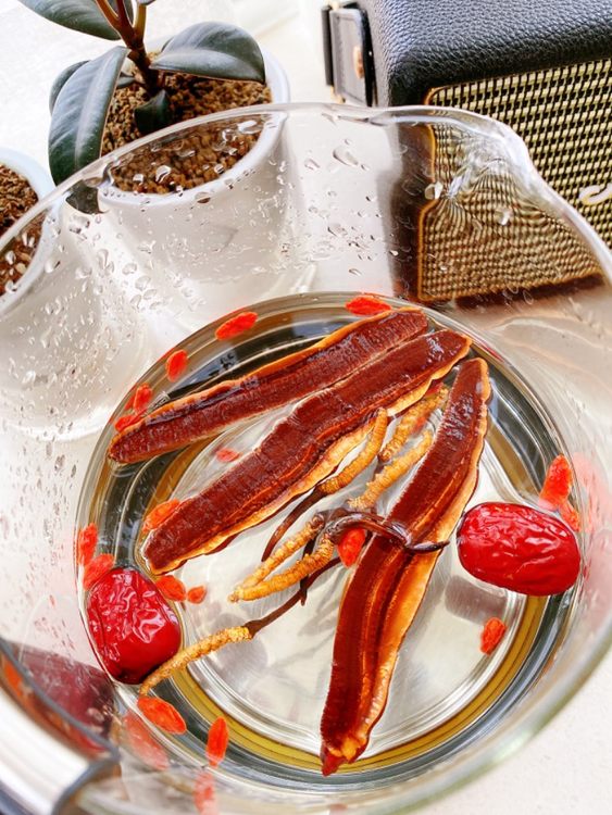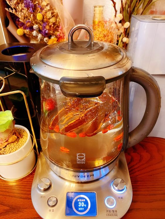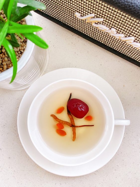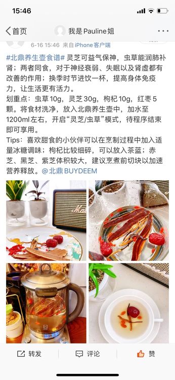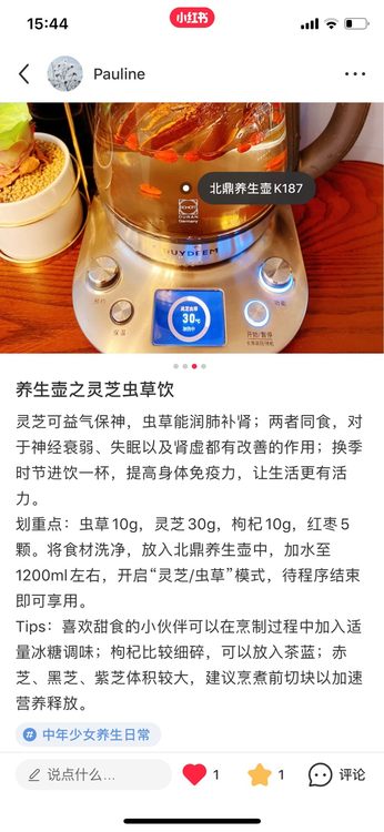 灵芝可益气保神,虫草能润肺补肾;两者同食,对于神经衰弱、失眠以及肾虚都有改善的作用;换季时节进饮一杯,提高身体免疫力,让生活更有活力。 划重点:虫草10g,灵芝30g,枸杞10g,红枣5颗。将食材洗净,放入北鼎养生壶中,加水至1200ml左右,开启“灵芝/虫草”模式,待程序结束即可享用。 Tips:喜欢甜食的小伙伴可以在烹制过程中加入适量冰糖调味;枸杞比较细碎,可以放入茶蓝;赤芝、黑芝、紫芝体积较大,建议烹煮前切块以加速营养释放。