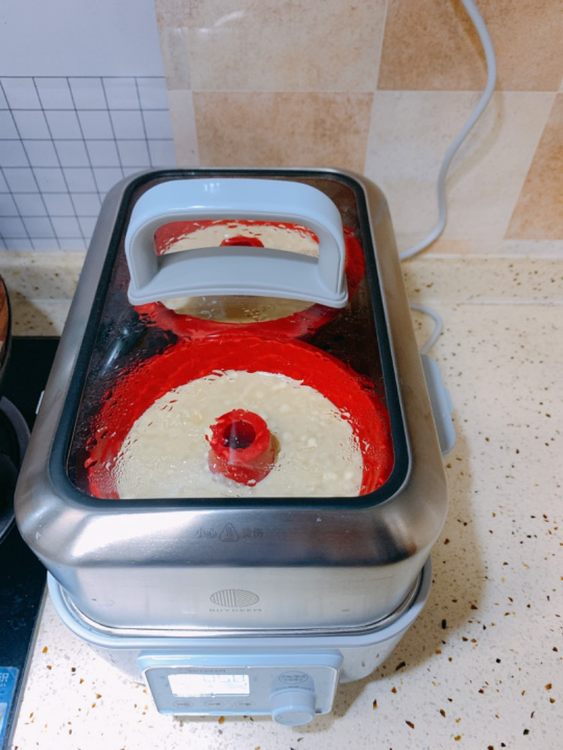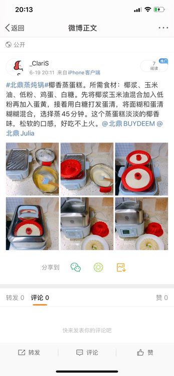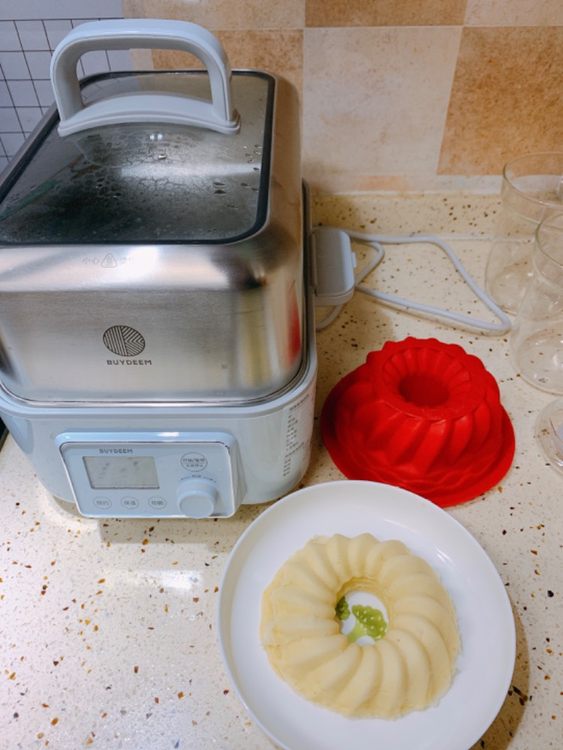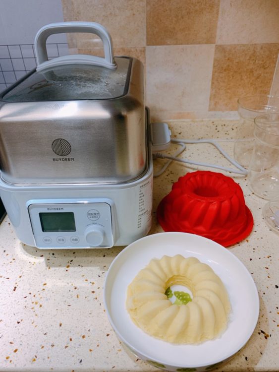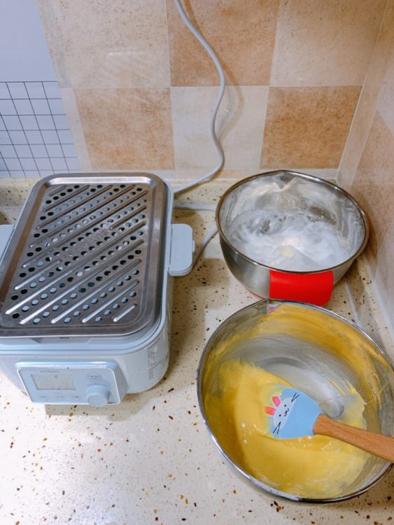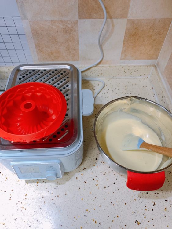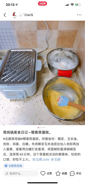 #北鼎蒸炖锅#椰香蒸蛋糕。所需食材:椰浆、玉米油、低粉、鸡蛋、白糖。先将椰浆玉米油混合加入低粉再加入蛋黄,接着用白糖打发蛋清,将面糊和蛋清糊糊混合,选择蒸45分钟。这个蒸蛋糕淡淡的椰香味,松软的口感,好吃不上火。@北鼎BUYDEEM @北鼎Julia