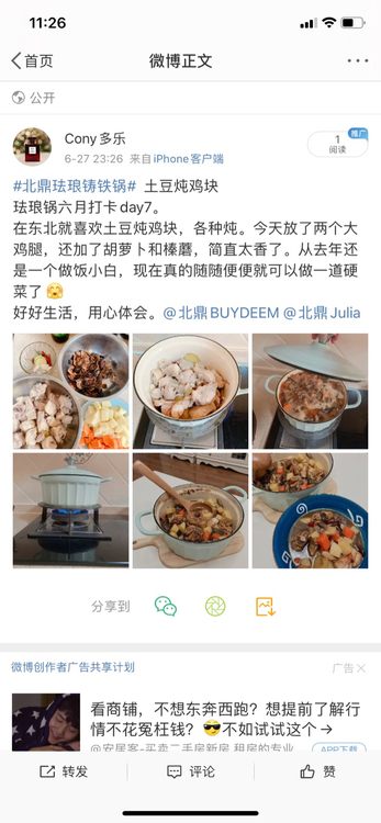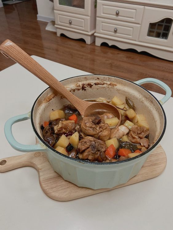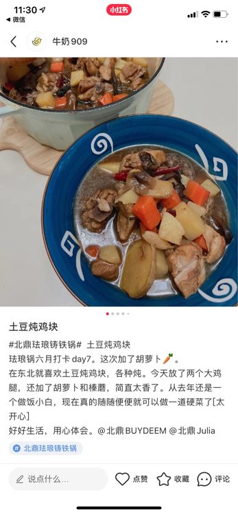 #北鼎珐琅铸铁锅# 土豆炖鸡块 珐琅锅六月打卡day7。这次还多加了胡萝! 在东北就喜欢土豆炖鸡块,各种炖。今天放了两个大鸡腿,还加了胡萝卜和榛蘑,简直太香了。从去年还是一个做饭小白,现在真的随随便便就可以做一道硬菜了[太开心] 好好生活,用心体会。@北鼎BUYDEEM @北鼎Julia