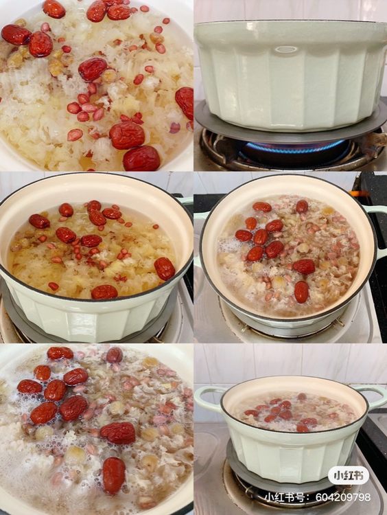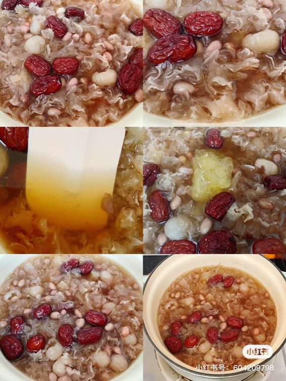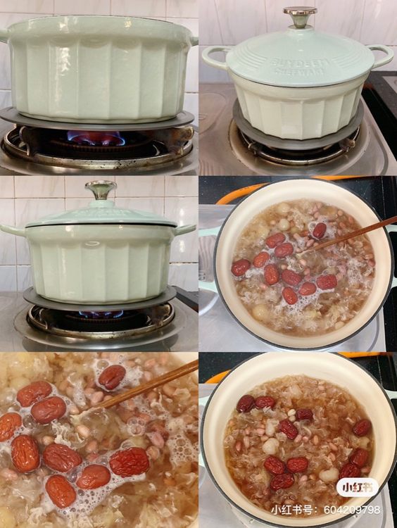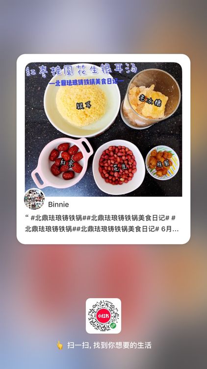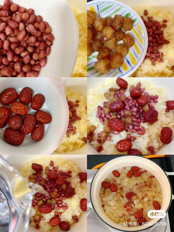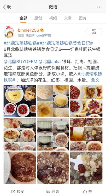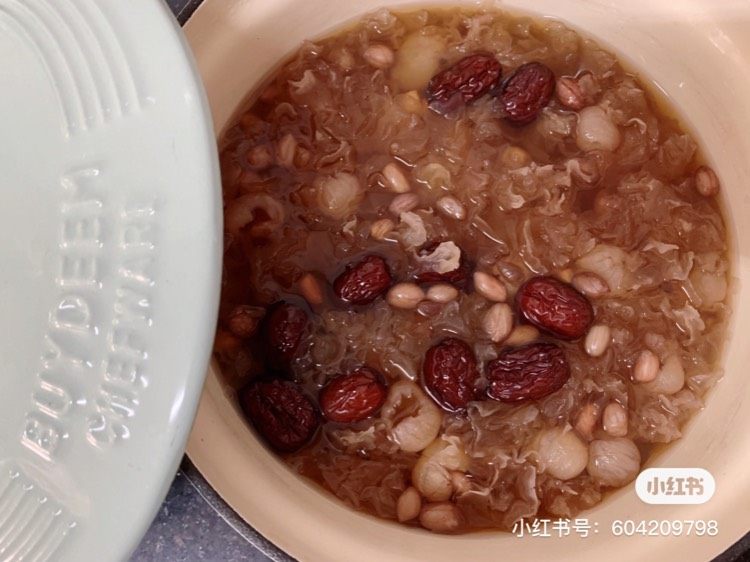 #北鼎珐琅铸铁锅##北鼎珐琅铸铁锅美食日记# 6月北鼎珐琅铸铁锅美食日记6——红枣桂圆花生银耳汤 @北鼎BUYDEEM @北鼎Julia 银耳、红枣、桂圆、花生,都是对人体很好的保健食材。把银耳提前浸泡祛除底部黄色部分,撕成小块,放入#北鼎珐琅铸铁锅# ,加洗净的花生、红枣、桂圆,水量没过食材中小火煮沸转小火煮至汤汁出胶即可。红枣桂圆花生银耳汤,清热健胃、养心安神,营养价值很丰富,是一款很适合夏季饮用的食补汤品~