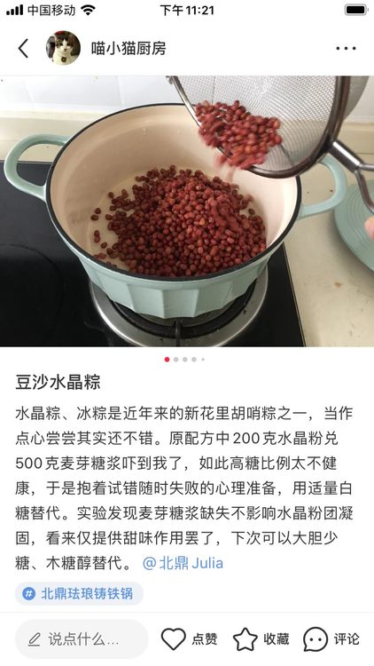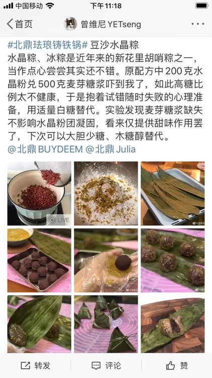 #北鼎珐琅铸铁锅# Day 12:豆沙水晶粽 水晶粽、冰粽是近年来的新花里胡哨粽之一,当作点心尝尝其实还不错。原配方中200克水晶粉兑500克麦芽糖浆吓到我了,如此高糖比例太不健康,于是抱着试错随时失败的心理准备,用适量白糖替代。实验发现麦芽糖浆缺失不影响水晶粉团凝固,看来仅提供甜味作用罢了,下次可以大胆少糖、木糖醇替代。 @北鼎BUYDEEM @北鼎Julia