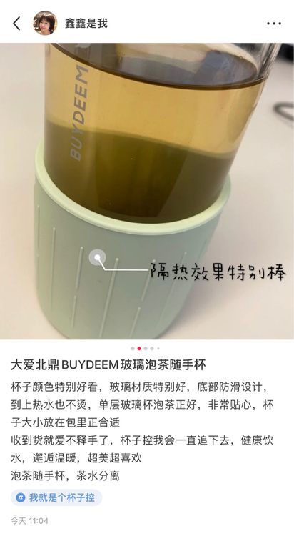 杯子颜色特别好看,玻璃材质特别好,底部防滑设计,到上热水也不烫,单层玻璃杯泡茶正好,非常贴心,杯子大小放在包里正合适 收到货就爱不释手了,杯子控我会一直追下去,健康饮水,邂逅温暖,超美超喜欢 泡茶随手杯,茶水分离