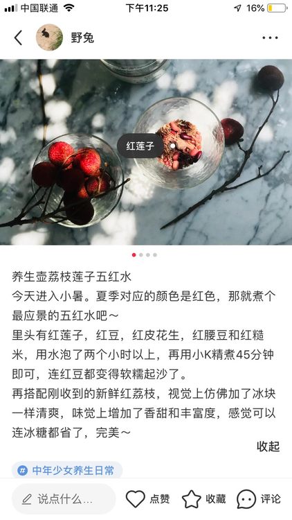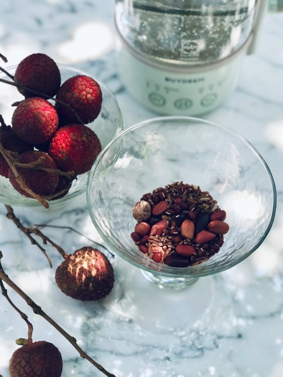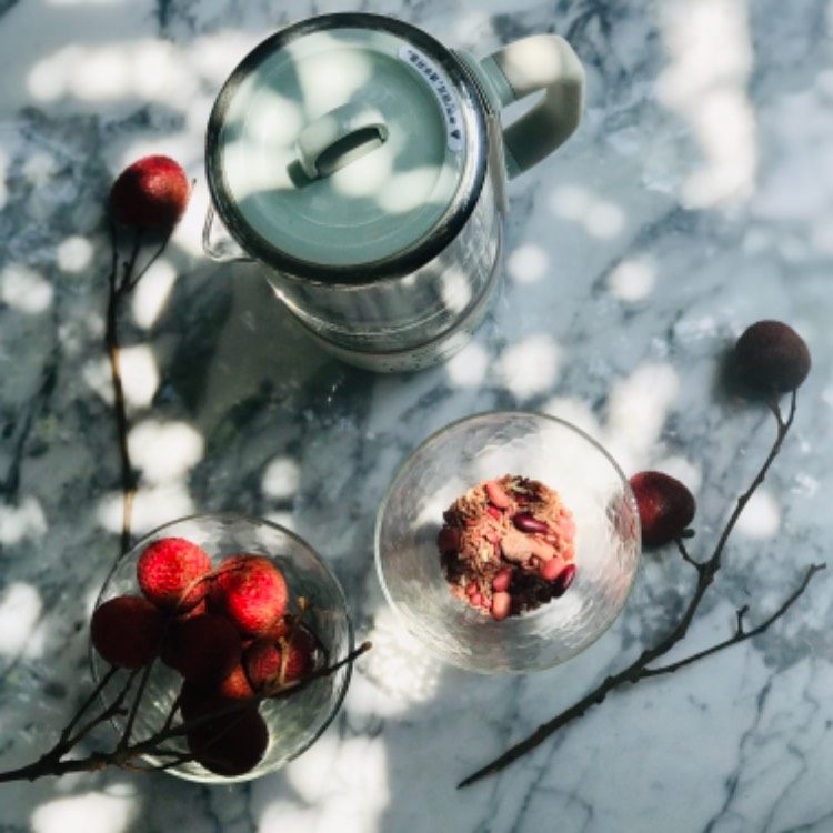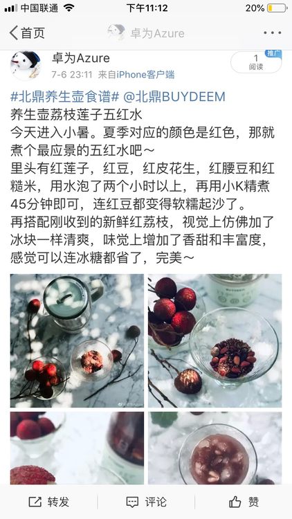 养生壶荔枝莲子五红水 今天进入小暑。夏季对应的颜色是红色,那就煮个最应景的五红水吧~ 里头有红莲子,红豆,红皮花生,红腰豆和红糙米,用水泡了两个小时以上,再用小K精煮45分钟即可,连红豆都变得软糯起沙了。 再搭配刚收到的新鲜红荔枝,视觉上仿佛加了冰块一样清爽,味觉上增加了香甜和丰富度,感觉可以连冰糖都省了,完美~