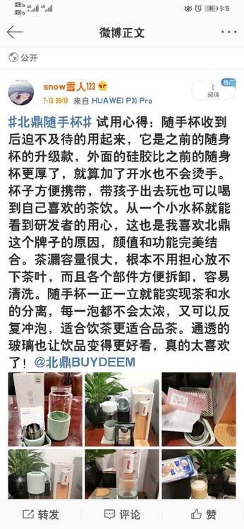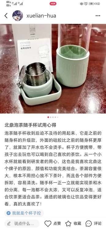 试用心得:随手杯收到后迫不及待的用起来,它是之前的随身杯的升级款,外面的硅胶比之前的随身杯更厚了,就算加了开水也不会烫手。杯子方便携带,带孩子出去玩也可以喝到自己喜欢的茶饮。从一个小水杯就能看到研发者的用心,这也是我喜欢北鼎这个牌子的原因,颜值和功能完美结合。茶漏容量很大,根本不用担心放不下茶叶,而且各个部件方便拆卸,容易清洗。随手杯一正一立就能实现茶和水的分离,每一泡都不会太浓,又可以反复冲泡,适合饮茶更适合品茶。通透的玻璃也让饮品变得更好看,真的太喜欢了!