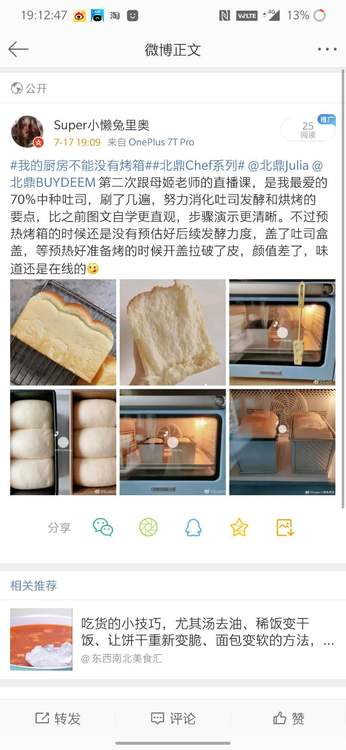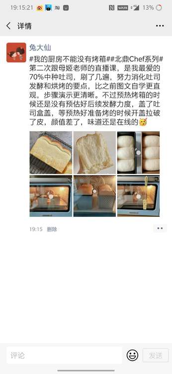 #我的厨房不能没有烤箱##北鼎Chef系列#第二次跟母姬老师的直播课,是我最爱的70%中种吐司,刷了几遍,努力消化吐司发酵和烘烤的要点,比之前图文自学更直观,步骤演示更清晰。不过预热烤箱的时候还是没有预估好后续发酵力度,盖了吐司盒盖,等预热好准备烤的时候开盖拉破了皮,颜值差了,味道还是在线的