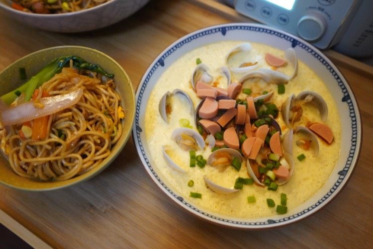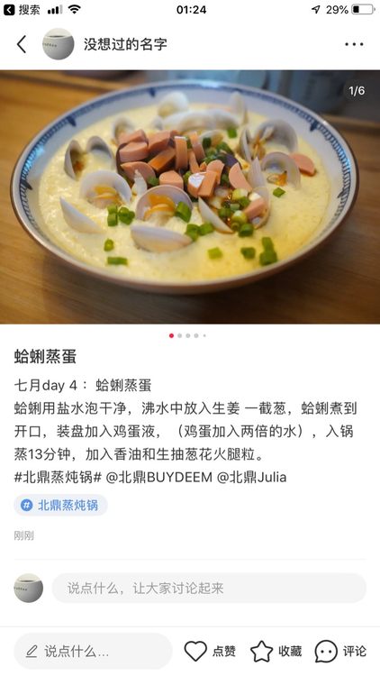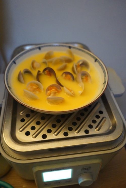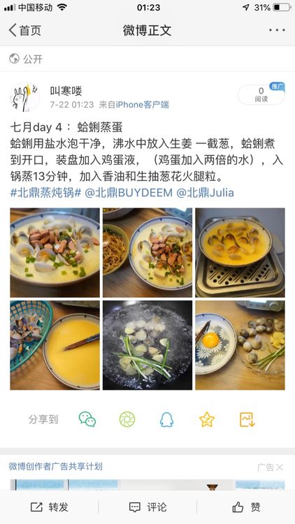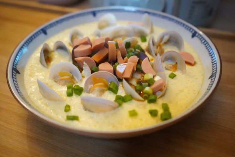 七月day 4 :蛤蜊蒸蛋 蛤蜊用盐水泡干净,沸水中放入生姜 一截葱,蛤蜊煮到开口,装盘加入鸡蛋液,(鸡蛋加入两倍的水),入锅蒸13分钟,加入香油和生抽葱花火腿粒。 #北鼎蒸炖锅# @北鼎BUYDEEM @北鼎Julia