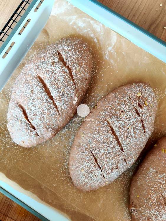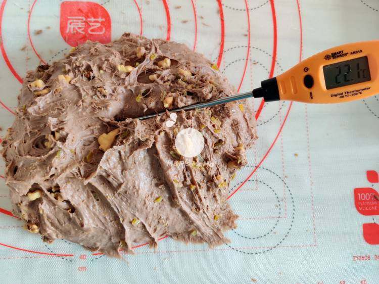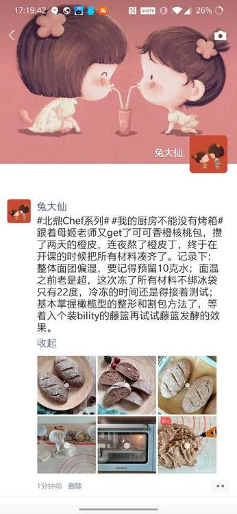 #北鼎Chef系列##我的厨房不能没有烤箱# 跟着母姬老师又get了可可香橙核桃包,攒了两天的橙皮,连夜熬了橙皮丁,终于在开课的时候把所有材料凑齐了。记录下:整体面团偏湿,要记得预留10克水;面温之前老是超,这次冻了所有材料不绑冰袋只有22度,冷冻的时间还是得接着测试;基本掌握橄榄型的整形和割包方法了,等着入个装bility的藤篮再试试藤篮发酵的效果。