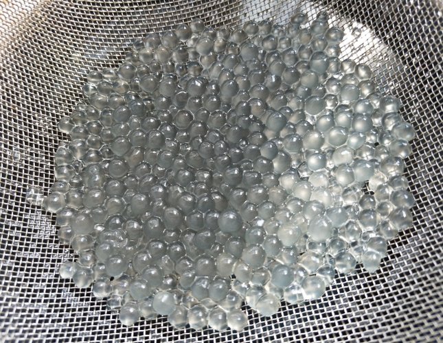 倒出西米用凉白开冲洗两三遍捞出,晶莹剔透的很Q。如果此时的小西米还有少许白色硬芯的话,请重复步骤3,再煮5分钟闷10分钟。