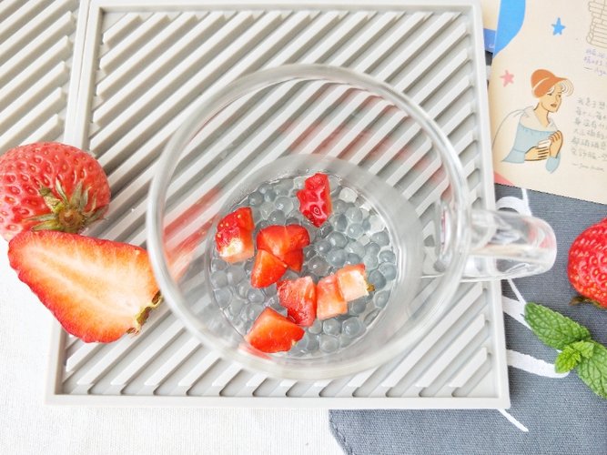 小西米放玻璃杯中,草莓切小块也放入。