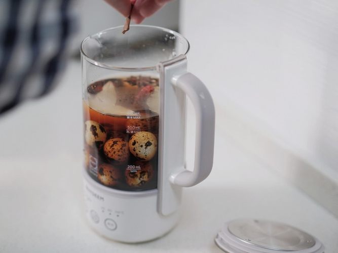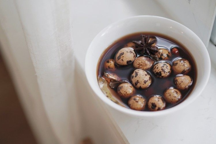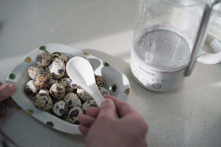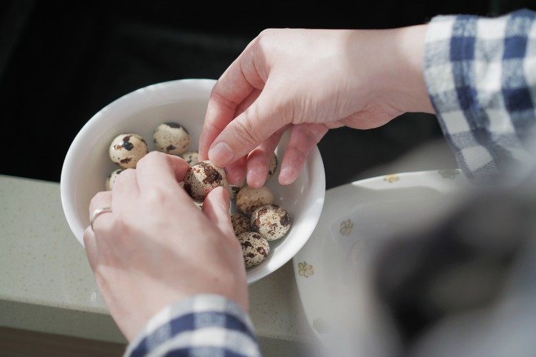 煮熟的鹌鹑蛋取出用勺子把蛋壳敲碎(更好入味)。