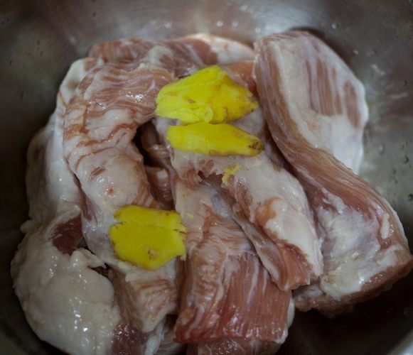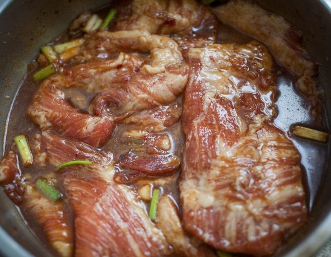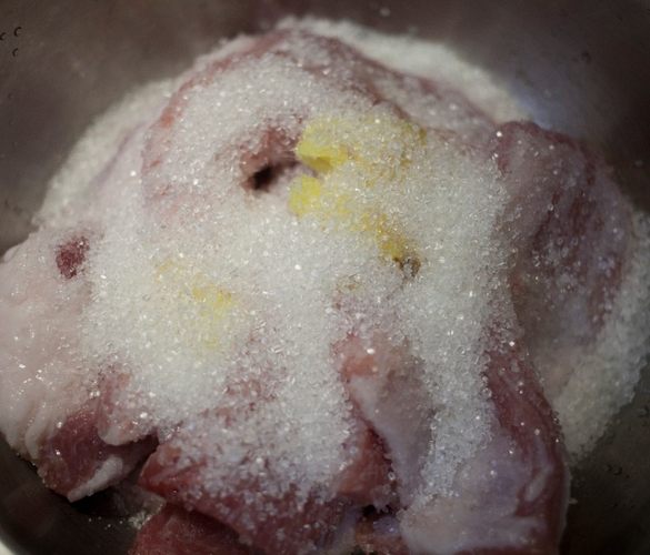 分别把调料放进肉里,带上手套搅拌均匀,让糖化开。