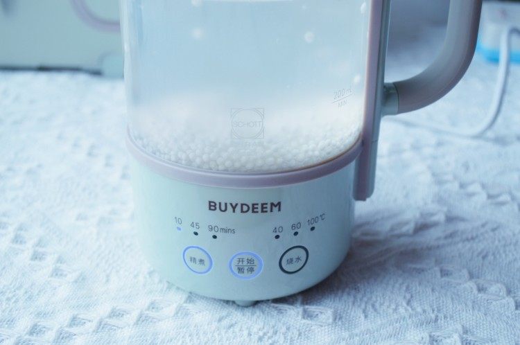 这时候开启精煮功能,触控按键启动10分钟精煮。待西米煮到只剩下一个小白心,长按开始键关机,焖到没有白芯。