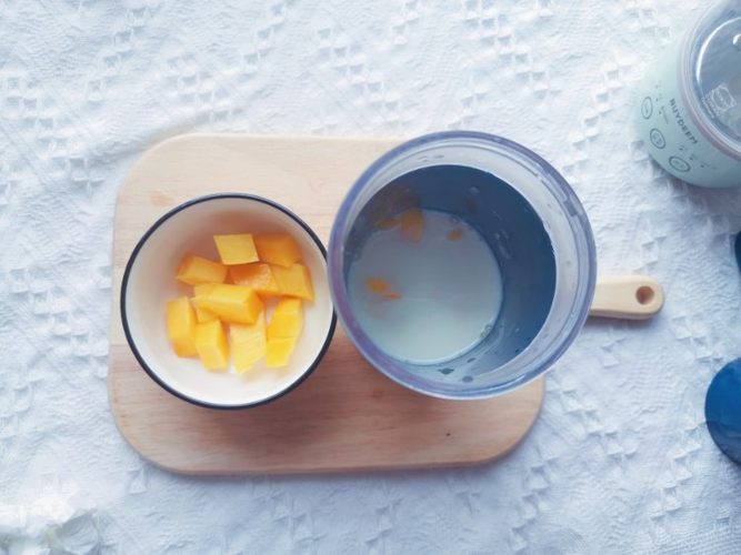芒果切小块,留几块备用,剩余的和牛奶倒入果汁杯榨成芒果泥。