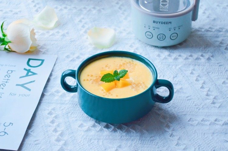 把芒果泥倒入碗中,倒上适量西米搅拌均匀,放上芒果粒就好啦。
