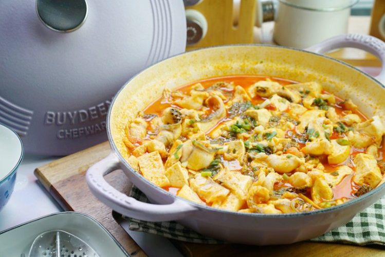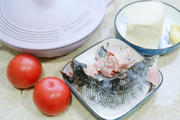 锅里加油下姜片小火煸至出香,豆腐改刀用盐水泡制,黑鱼去骨切片,番茄去皮切小丁。