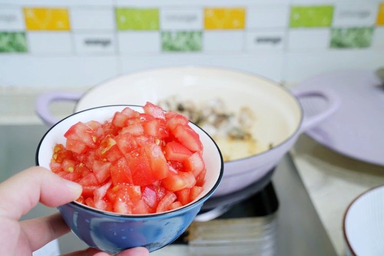 然后再加入番茄丁,炒至微微出沙的状态就可以。