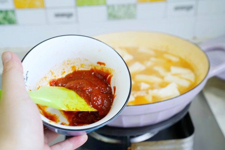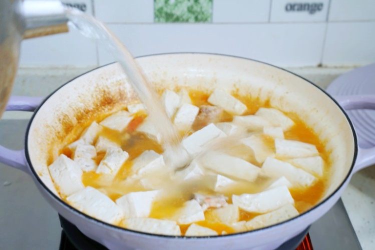 豆腐块下锅之后不要翻,上盖子,转中火焖3分钟。