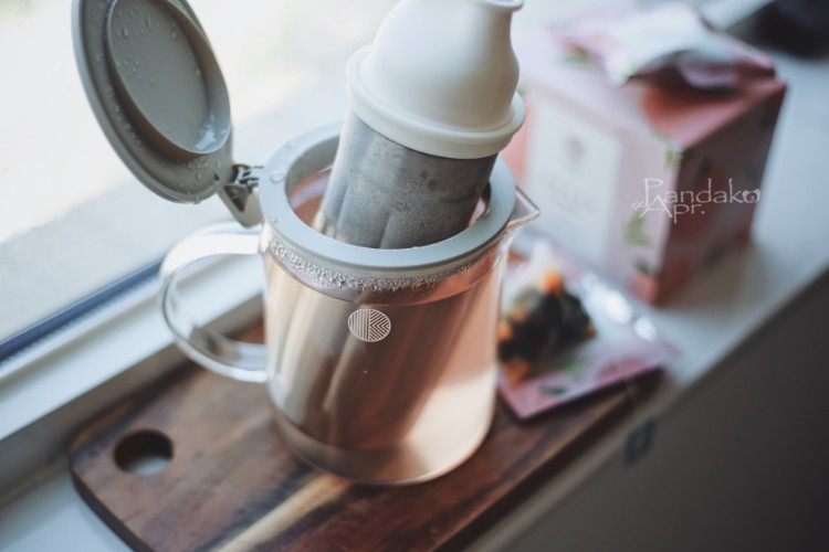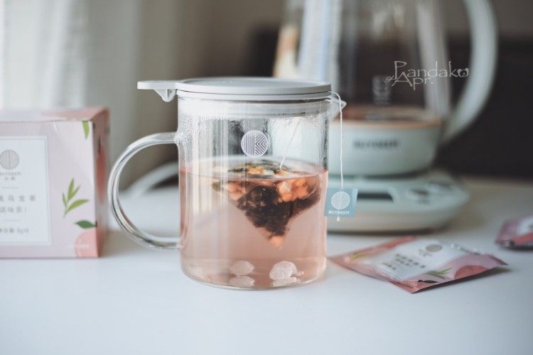 煮好的桃皮水倒入泡茶壶中,加入一包蜜桃乌龙茶包和适量冰糖,泡3分钟后取出茶包。