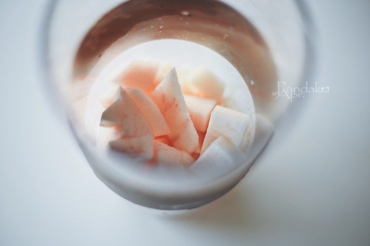 桃子肉切成小块,加入少许柠檬汁、适量糖浆,用料理棒打成果泥。