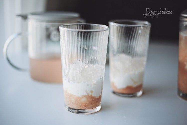 准备饮品杯:取一少部分桃肉铺底,依次放入酸奶、西米。