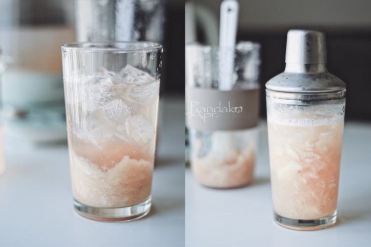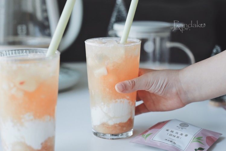 制作茶底:剩下的桃肉果泥倒入杯中,加入冰块摇匀。因为茶包和果泥已经添加了糖份,这一步就没有额外再加糖浆了,如果嗜甜的话,也可以根据个人口味添加。