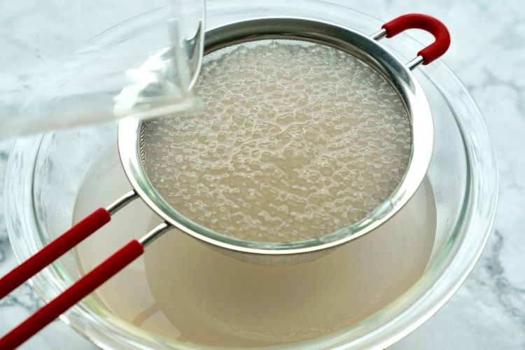 西米另装一个碗,倒入一杯冰水略搅拌后滤出。再加一杯冰水浸泡,放冰箱备用。