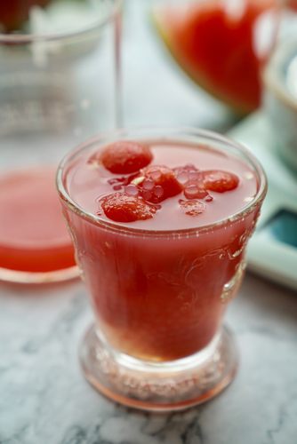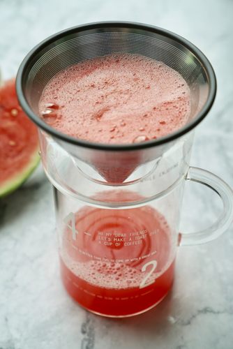 先用勺子在西瓜上挖几个球备用。西瓜切块榨汁后,滤掉西瓜纤维。