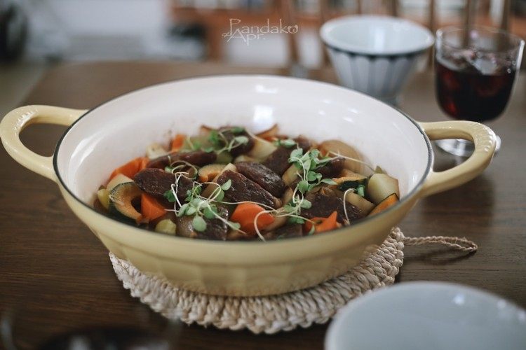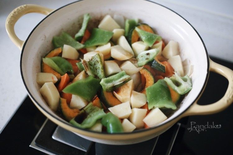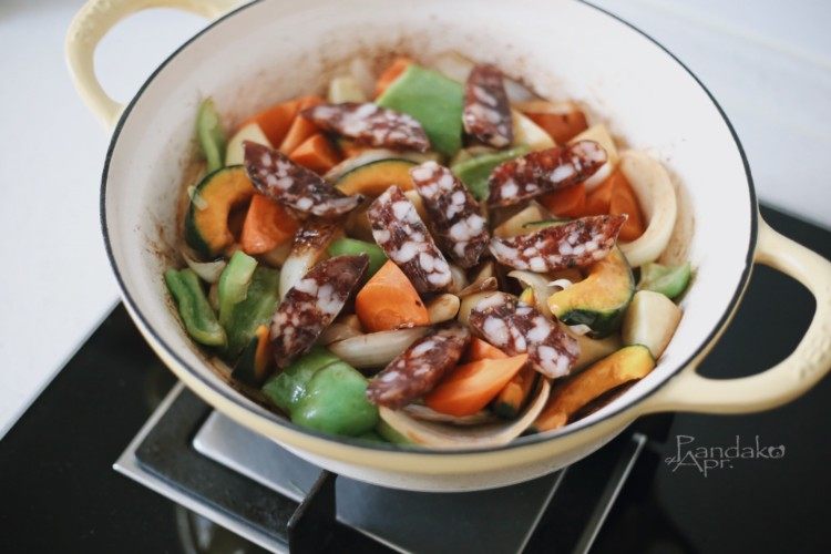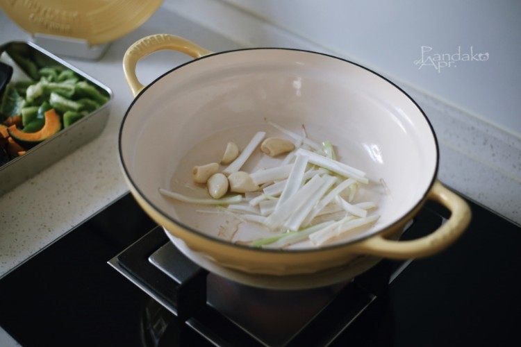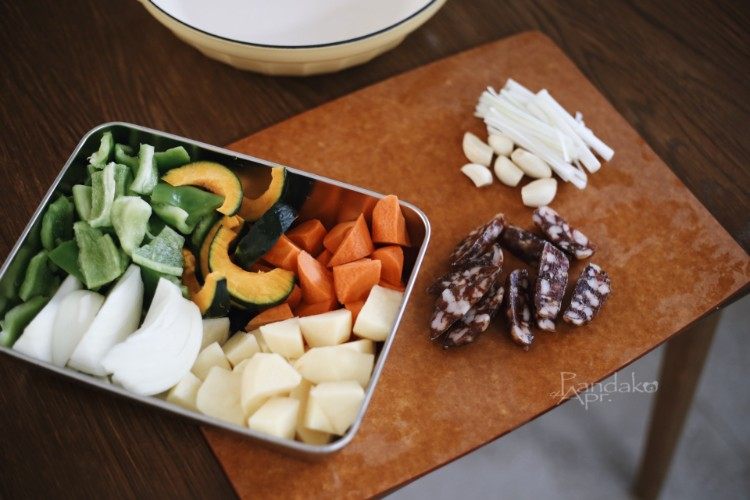 大蒜整粒剥皮,葱白切丝,土豆、胡萝卜切滚刀块,贝贝南瓜和洋葱切瓣,青椒手撕小块儿,腊肠对半切开,备用。