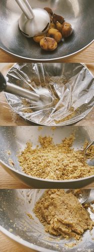 熟栗子仁用料理棒打成粉,加入8g砂糖,和50毫升牛奶,搅拌成栗子泥备用(没有料理棒就用保鲜袋+擀面杖。用这个方法,栗子就多放几颗,因为栗子泥会粘在保鲜袋上)。