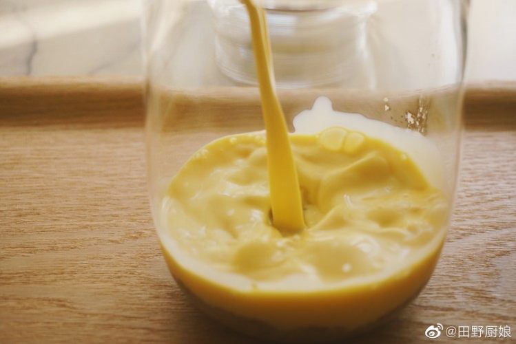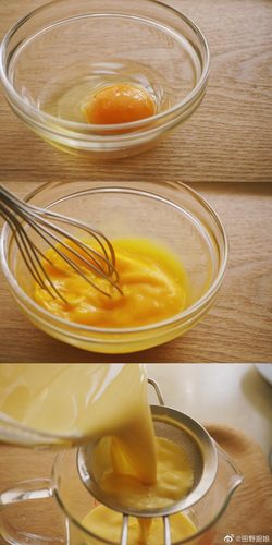 鸡蛋抽打均匀,然后缓缓倒入热牛奶,持续搅拌。这时候加入一点点香草精,混合均匀的牛奶鸡蛋液过筛。