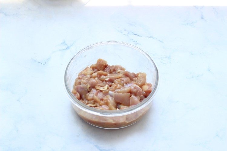 鸡大腿去掉鸡皮,鸡骨头后,切小块,用料酒,淀粉,一点点盐,生抽,抓均匀腌制20分钟左右。