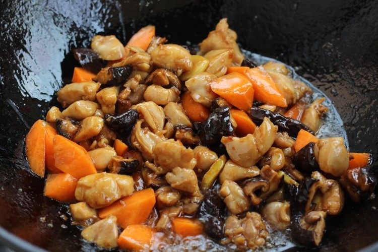 先炒鸡肉,炒锅加入适量油,爆一下姜片。倒入腌好的鸡肉,炒至变色后,加蚝油,加点糖提个味。