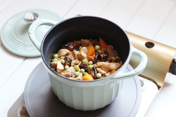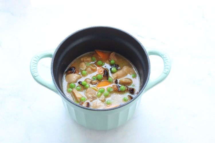 把炒好的食材全部倒入北鼎珐琅焖煮锅里,注入盖过食材大约1厘米的水,可以加点豌豆点缀下。