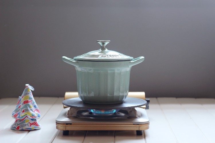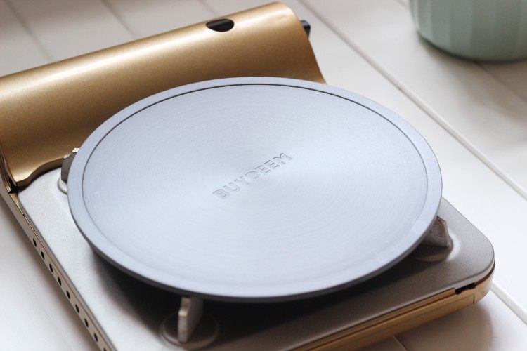 为了让锅受热更均匀,也避免锅底变色,我们在炉子上放上一块导热板。