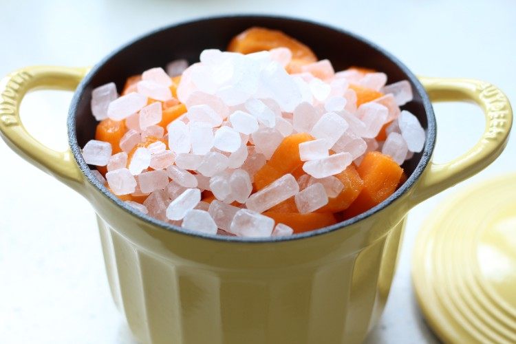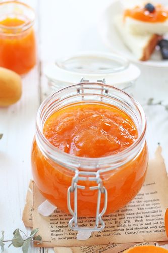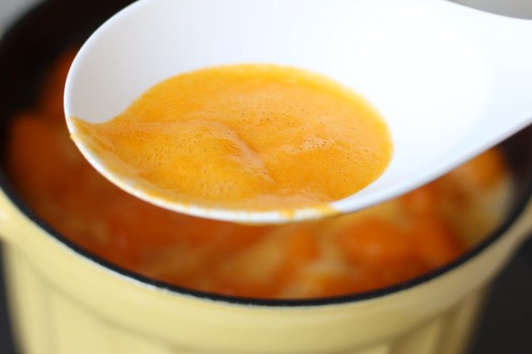 捞去表面的浮沫(熬煮过程中,水果会出现涩汁和泡沫,会影响果酱的口感、色泽和风味,一定要捞出哦)。