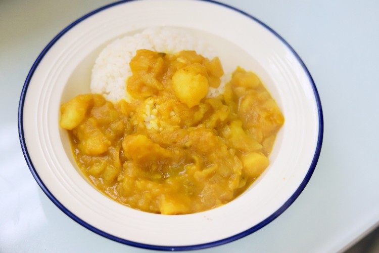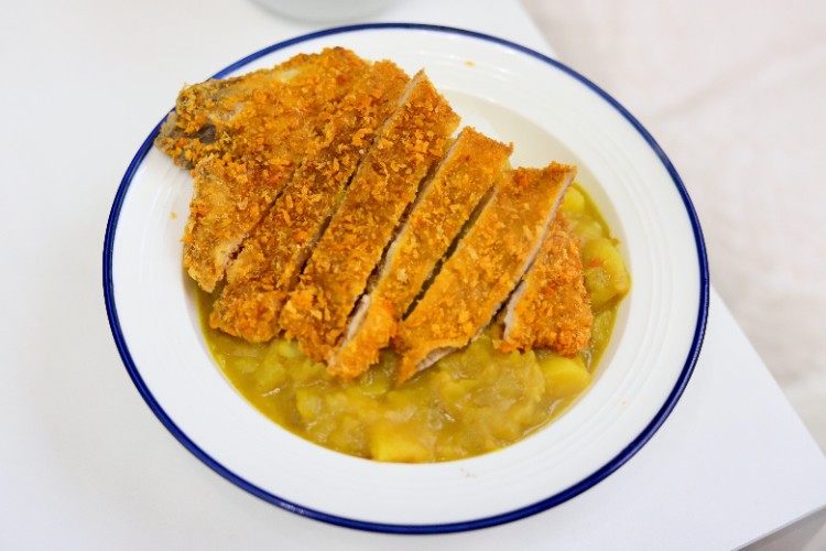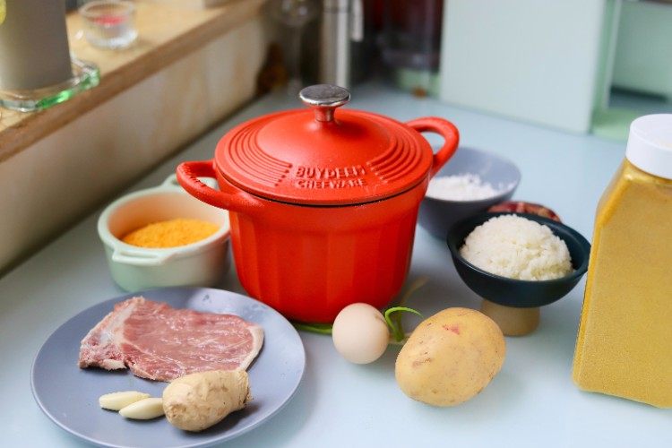 准备食材:猪大排1片克、土豆1个,米饭1碗、洋葱1/4个、香葱1根,生姜1块,大蒜2瓣,鸡蛋1个,面包糠1碗、面粉1碗、咖喱粉1.5勺。