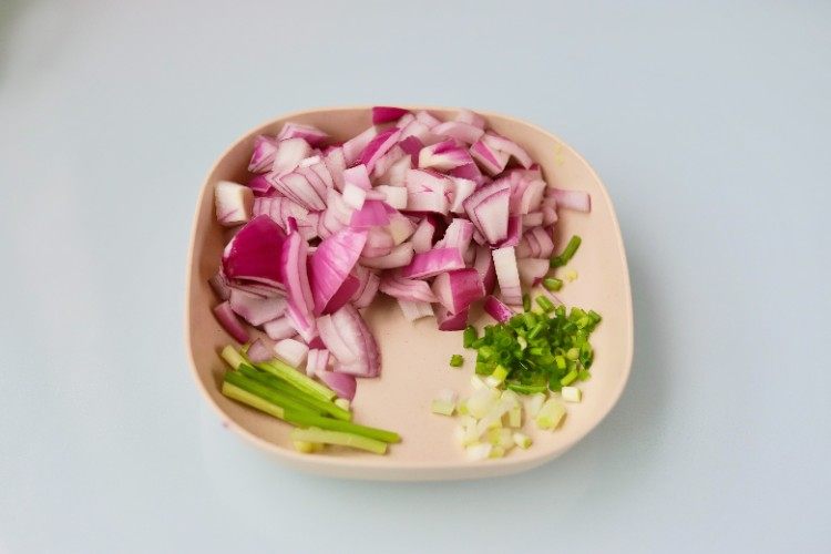 洋葱切小块、香葱切葱花、葱白部分切段、大蒜切末。