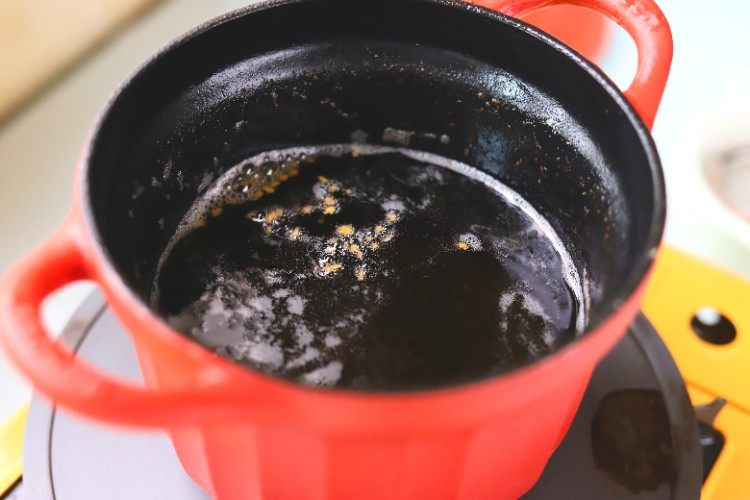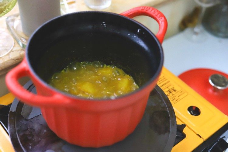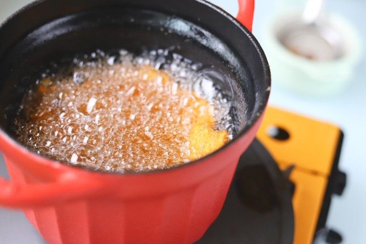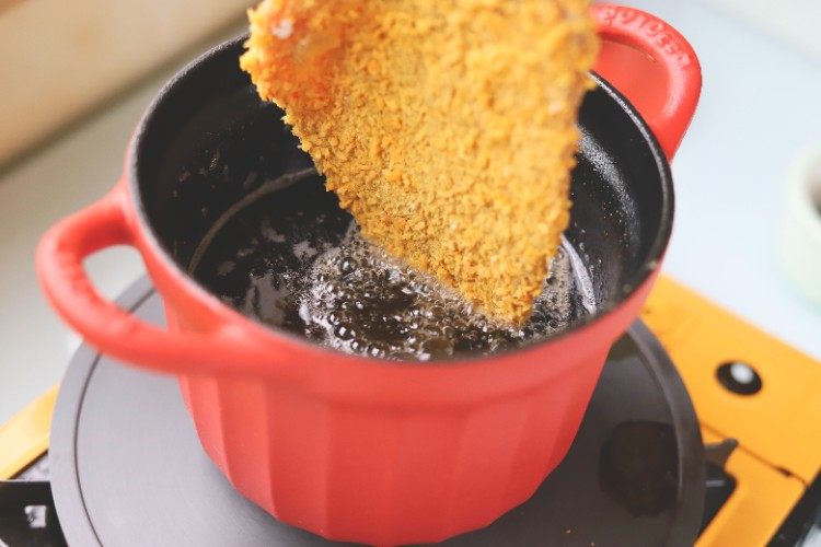 明火上放着北鼎导热盘,在珐琅锅中倒入半锅油,加热至丢2粒面包糠会看到立马浮起来时,立即转小火。
