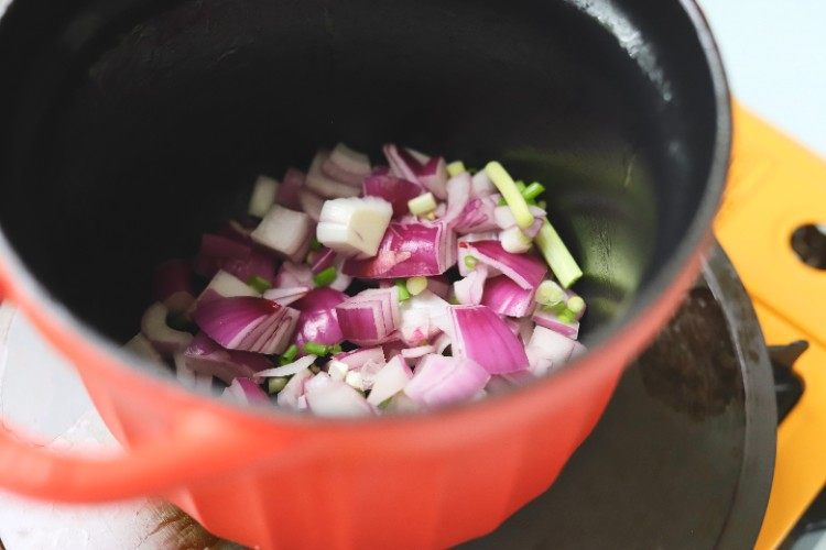 倒出剩余的油,放入洋葱、大蒜、葱段略微翻炒出香味。