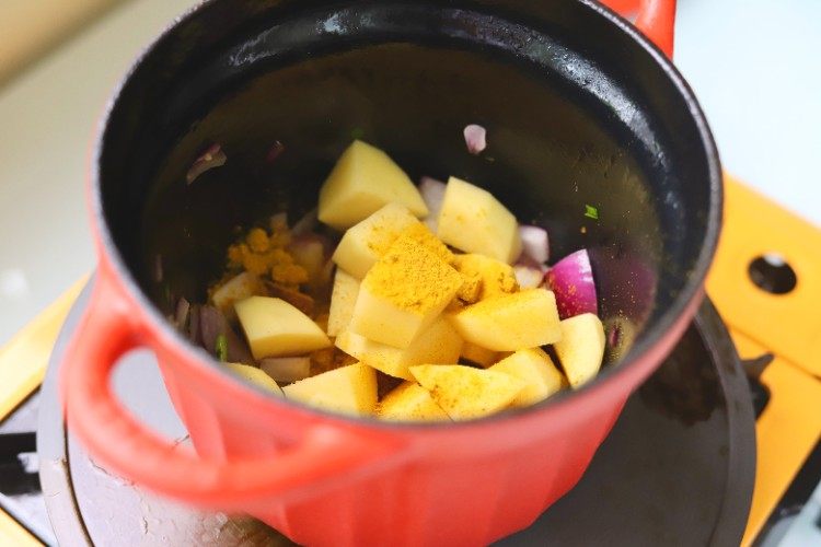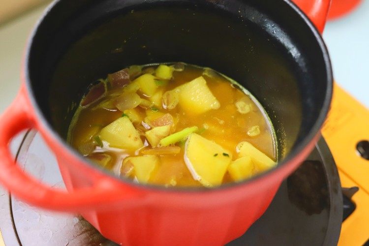 加水刚好没过食材,盖上焖煮锅的盖子小火焖10分钟。