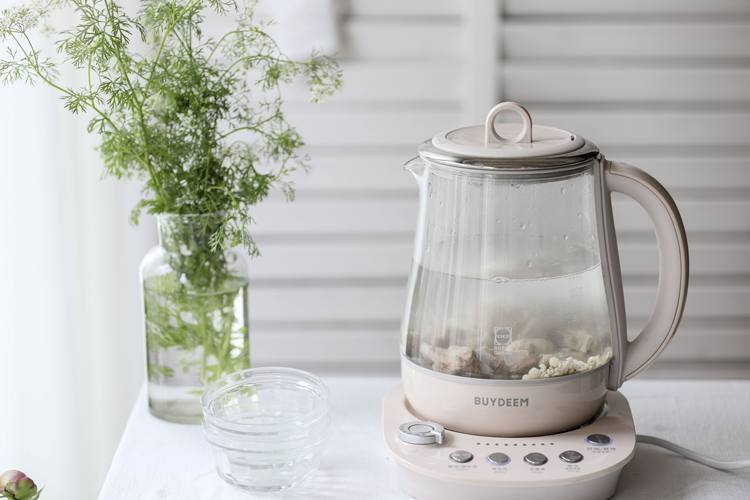待养生壶工作结束后,洗净养生壶,然后将薏米、芡实5g清洗干净,放入北鼎养生壶中,加水至1200ml,启动养生汤模式。待养生壶工作模式结束后,加入适量的盐调味即可。