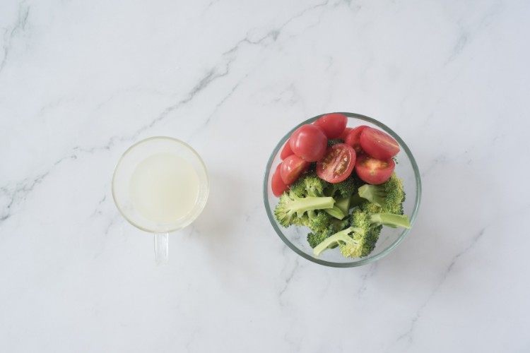 取一个柠檬挤汁,另一个切片装饰,小番茄对半切开,西兰花切小块