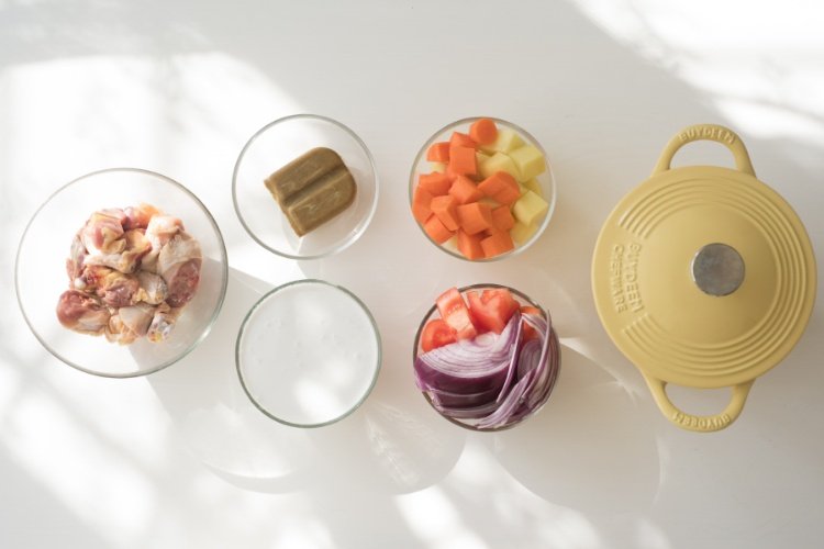 鸡腿切块洗净,用水泡20分钟左右,胡萝卜和土豆切成2厘米左右的方块,番茄切块,洋葱切粗丝