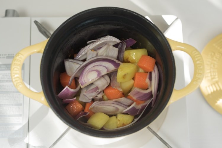加入洋葱,炒出香味,将锅内杂蔬盛起来备用