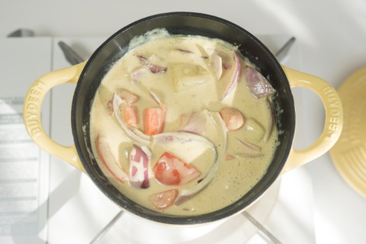 中火烧开后,加入杂蔬和番茄,盖上盖子,小火焖煮15分钟,起锅前加入适量盐即可。