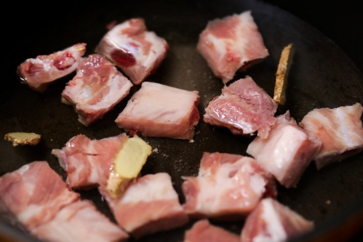 大米淘洗2-3次,用水浸泡25分钟后捞出沥干水份备用。排骨斩块,放入冷水锅加姜片和黄酒中火煮沸,变色后去掉浮沫,捞出备用;