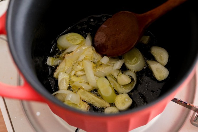小圆锅倒入食用油后烧热,油热放入大葱炒香,捞出大葱留底油;